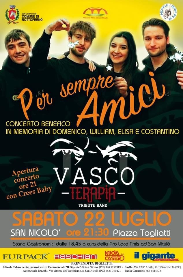 I biglietti per il concerto “Per sempre amici” (15 euro) sono già disponibili in prevendita a San Nicolò all’edicola del centro commerciale Il Gigante, al Bar Ba di via XXV Aprile e all’Autoscuola Bracchi, oppure telefonando al 366.4414573. Potranno inoltre essere acquistati direttamente all’ingresso della serata del 22 luglio.