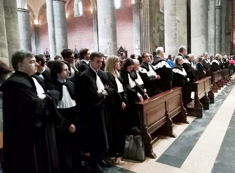 Il sindaco Patrizia Barbieri, con il direttore della Cattolica Mauro Balordi e i presidi di facoltà Annamaria Fellegara, Marco Trevisan, Luigi Pati e tutti i docenti, in abbigliamento accademico, in prima fila, hanno partecipato all’avvenimento.