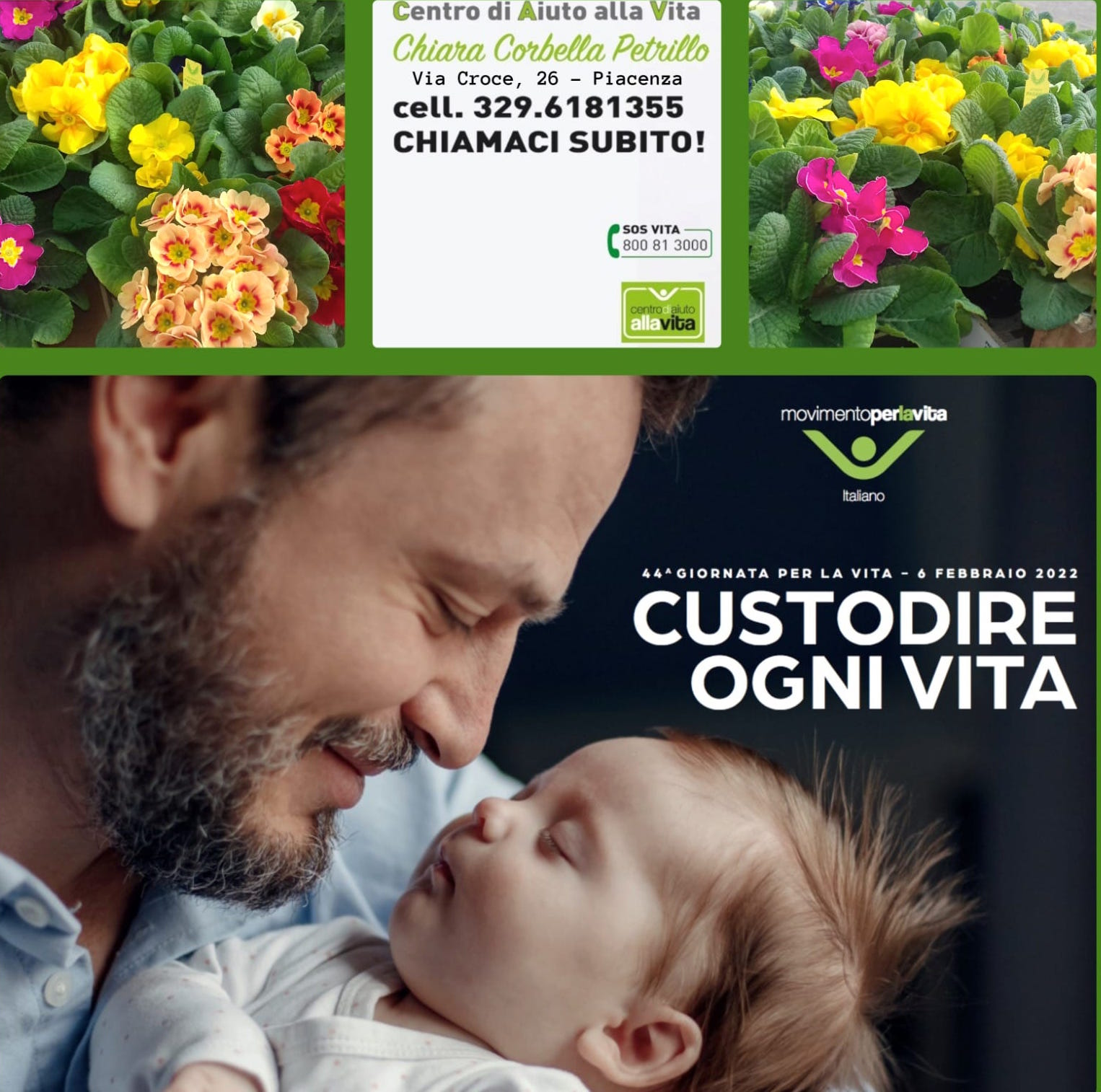 Domenica 6 febbraio la Chiesa italiana celebra la 44ªGiornata per la Vita, sul tema "Custodire ogni vita". Anche nelle parrocchie della diocesi l'invito è a pregare con questa particolare intenzione. Per l'occasione in alcune parrocchie tornano anche le "primule della vita" con le volontarie del Centro di Aiuto alla Vita "Chiara Corbella Petrillo" di Piacenza. I banchetti saranno in città domenica 6 febbraio nelle parrocchie di Sant'Antonio Abate (qui anche dopo la messa prefestiva di sabato pomeriggio 5 febbraio), San Vittore (quartiere Besurica), Santi Angeli Custodi (Borgotrebbia), San Giuseppe Operaio in viale Martiri della Resistenza, Santa Teresa sul Corso, Sacra Famiglia all'Infrangibile, Nostra Signora di Lourdes in via Damiani. In provincia, si potranno trovare le primule nella mattinata di domenica 6 di fronte alle chiese di Gragnano Trebbiense, Podenzano e Turro (qui anche alla prefestiva di sabato 5).